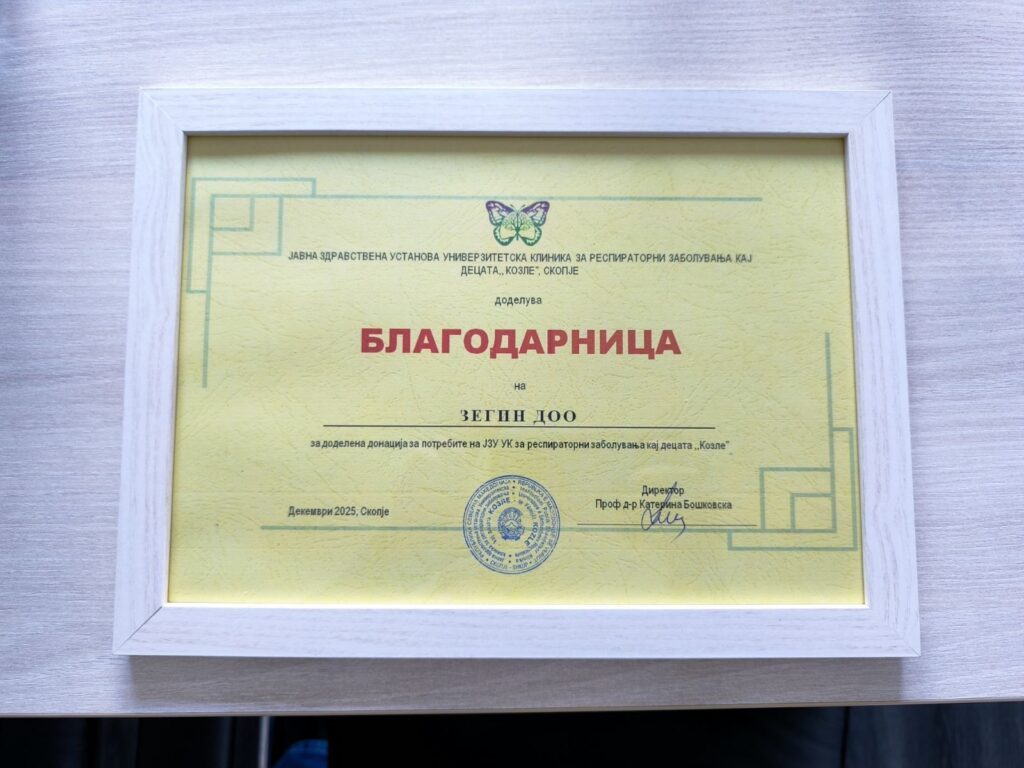Sot kompania Zegin dhe Fondacioni Dr. Verica Mekhandzhiska realizuan edhe një donacion tjetër. Këtë herë bëhet fjalë për disa elemente të dedikuara për ISHP UK për sëmundje respiratore te fëmijët “Kozle” – Shkup, e cila është një institucion i specializuar për trajtimin e fëmijëve të moshës 0–18 vjeç. U dhuruan njëmbëdhjetë shtretër me dyshekë, njëzet inhalatorë dhe njëzet kuti formule organike të adaptuar nga qumështi i dhisë të brendit Holle.